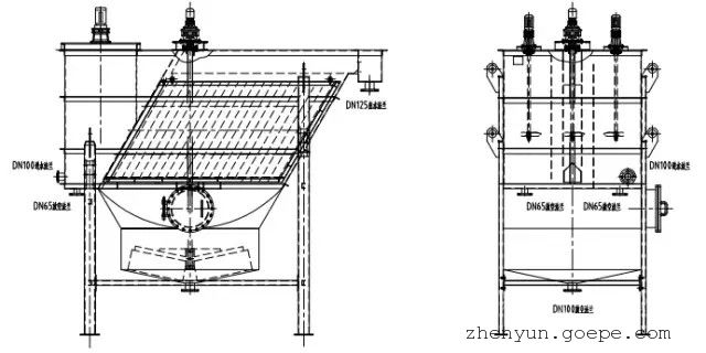 b.带刮泥机沉淀池 此类带集刮泥机的高效斜板沉淀池,适用于污水中污泥负荷较大,污泥沉降性能好的水质,污泥通过下部刮泥机刮至泥斗后排出。