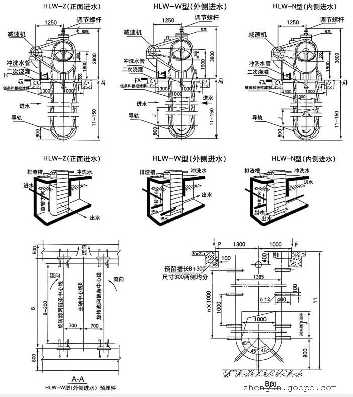 注:p以h=20m计,h每增加1m,则p总=p+△p;型号参数 XL-2000 XL-2500 XL-3000 XL-3500 XL-4000 滤网名义宽度b(mm) 2000 2500 3000 3500 4000 渠道宽度 2100 2600 3100 3600 4100 网孔尺寸a×a(mm) 3×3、4×4、5×5、6×6、8×8、10×10 安装角度α(°) 90 安装深度h(mm) 5000~20000 滤网回转速度v(m/min) 3.6~4.0 过网流速v′(m/s) 0.8 电动机功率n(kw) 2.2~4.0 3.0~5.5 4.0~7.5 牵引链节距t(mm) 500/600 *大过水量q(m3/h) 2350 3050 3750 4400 5050 允许水位差h(mm) 200 冲洗喷嘴数(个) 25 31 37 43 49 冲洗水水压p(mpa) ≥0.3 冲洗水量q(m3/h) 90 110 135 155 175 *大组件起吊重量g(kg) 3650 3950 4250 4550 5000 *大组件起吊高度(m) 3.0