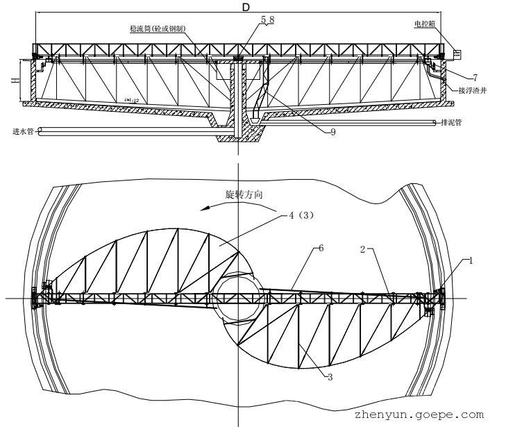 驱动装置带动刮泥机绕沉淀池中心旋转,原水经沉淀池沉淀后,上清液从溢流堰板排出,沉淀于池底的污泥,在对数螺旋曲线形刮板的推动下,缓慢地沿池底流向中央集泥槽内,通过排泥管排出。同时池面浮渣被撇渣板刮集至浮渣挡板附近的区域,当撇渣装置耙渣板经过浮渣筒时,浮渣被刮至浮渣筒落渣口,水流冲洗浮渣通过排渣管排出到池外旁边的浮渣井中。合理的浮渣井结构使得渣水有效分离。
