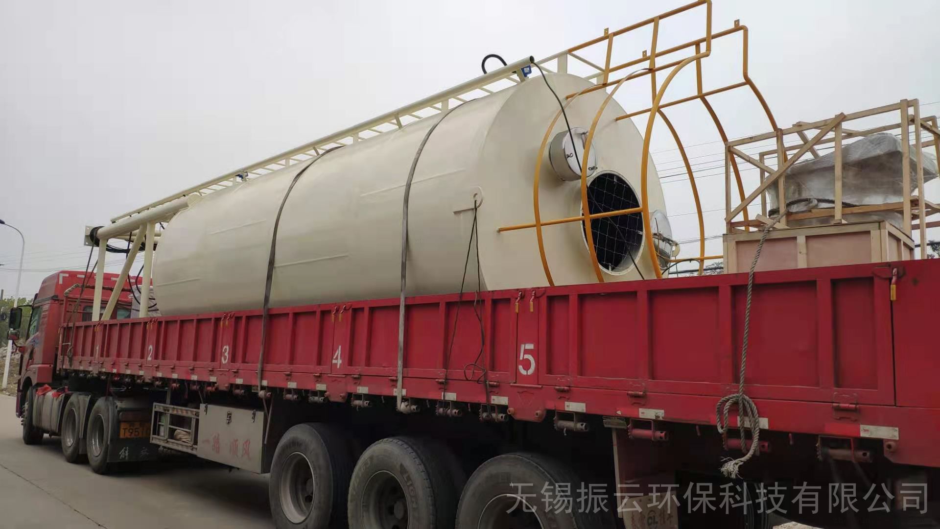 石灰由运输车自带的压缩空气通过进料管送到筒仓内;粉料和压缩空气的混合无进入料仓时,经仓顶除尘器过滤后,空气排出,仓顶除尘器的滤袋由清洁装置振荡清理,将料粉振落至料仓内。